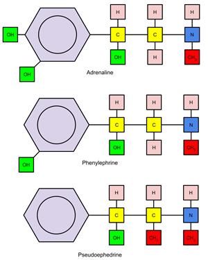 Pseudoephedrine has no hydroxyl groups on the benzene ring. This absence reduces its polarity compared to adrenaline and phenylephrine. It is used as a nasal decongestant.