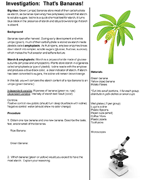 Once students have viewed the cells, they sketch them and answer questions. Questions will lead them to the conclusion that green bananas have more starch granules than ripe bananas.