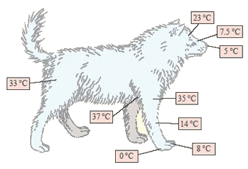 The second graph of this page shows how insulation and layers of skin warm air before it gets to body tissues. The third images shows a dog with body temperatures displayed for different parts of the body. The nose and paws tend to be colder than other parts of the body.