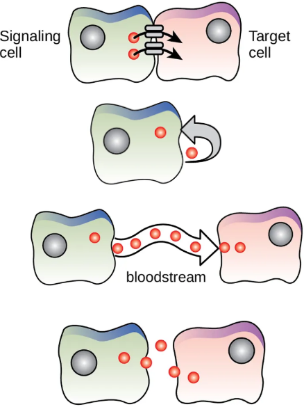 Endocrine - cell targets a distant cell (using chemical messengers known as hormones)