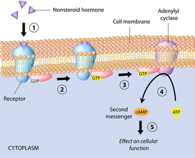 1. Ligand 2. Receptor 3. G protein 4. GTP 5. Adenylyl Cyclace