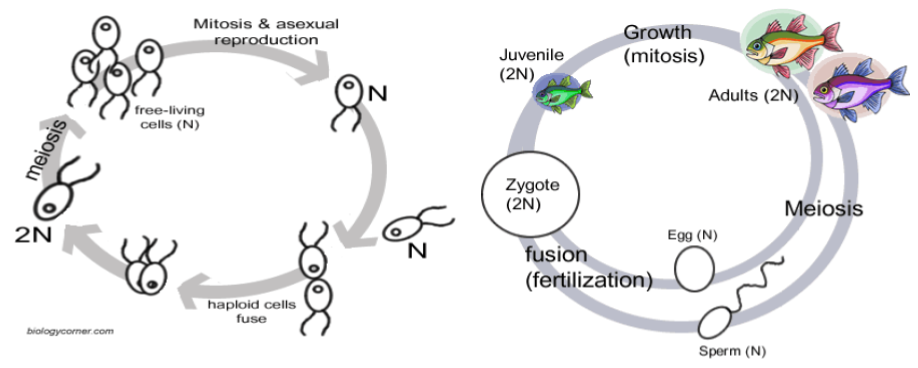 - Haploid (n): A single set of chromosomes (e.g., sperm, eggs, or spores).