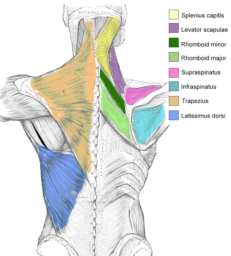 - Rhomboids (major and minor): These muscles are located between the shoulder blades and help retract and stabilize the scapulae (shoulder blades).