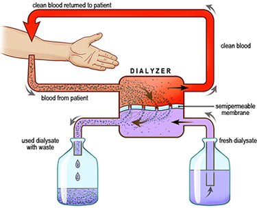 7. Dialysis is a process where a person with nonfunctioning kidneys can have their blood filtered by a machine. The image outlines this process. Relabel the image to indicate which parts would match the anatomy of the kidney: