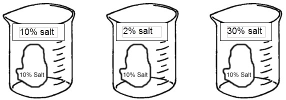 6. In each of the situations pictured, indicate whether the cell will gain water, lose water, or stay the same. In each case, the cell in the beaker is 10% salt.