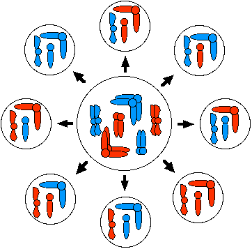 Crossing Over - chromosomes exchange sections (increases variability) Independent Assortment In addition to Crossing-Over, the process of meiosis ensures that chromosomes are randomly assorted. The following images show three separate possibility for a single cell that has undergone meiosis. Look at all the different combinations.