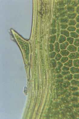 This is a view of a leaf. Notice the blocky cells on the right that lie underneath the surface of the leaf.