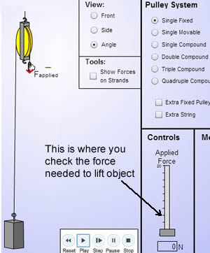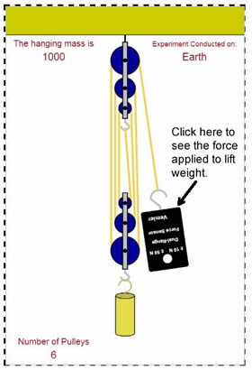 Simulation: In this program, you can change the size of the mass and change the number of pulleys. You can also change gravity by changing the planet where you conduct the experiment. Clicking on the vernier probe will show you how much force is being applied to lift the mass.