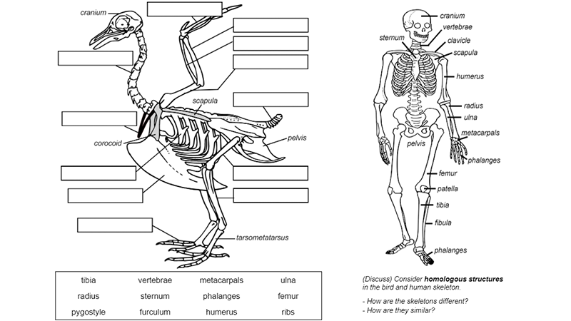 Labeling worksheet showing a bird skeleton compared to a human. Students fill in the labels using a word bank and discuss similarities to the human skeleton.