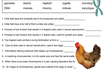 Helpful review on chromosomes which focuses on terms such as diploid and haploid, mitosis and meiosis, and zygote versus gamete. Students also practice chromosome math using chickens as a model, which have 78 chromosomes in body cells. Worksheet is intended as a review for basic level biology students.