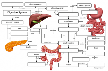 Students use this concept map to reinforce their understanding of the digestive system and how structures within that system are related. The mouth is where food is chewed and mixed with saliva. Saliva contains enzymes that start to break down food. The esophagus is a muscular tube that connects the mouth to the stomach. The…