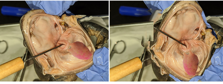 You can see that just behind the tongue is an slit shaped opening called the glottis. The glottis is the airway to the lung and is separate from the larger opening behind it, the esophagus.