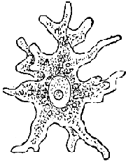 , and leave the ectoplasm uncolored. By pushing the endoplasm toward the cell membrane, the ameba causes its body to extend and creep along. It is also by this method that the ameba consumes its food. The pseudopodia extend out and wrap around a food particle in a process call phagocytosis. The engulfed food then becomes a food vacuole. There are several food vacuoles on the drawing – color each brown