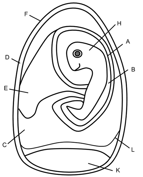 To understand this, you must first understand the egg itself. Inside the egg are a series of fluid-filled membranes which permit the embryo to survive: the amnion, allantois, yolk sac, and chorion. Surrounding and protecting the embryo is the amnion, filled with amniotic fluid, and providing the embryo with a watery environment. Recall that amphibians had to return to water to lay eggs, reptiles were the first group to live completely on the land. The amniote egg allowed them to place their eggs on dry land, the water (amniotic fluid) was IN the egg. Color the amnion dark blue and the fluid inside surrounding the embryo light blue. Color the embryo red.