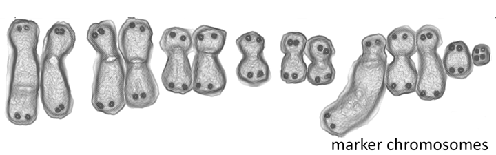 Another feature of DFTD is the chromosome makeup of the cancer cells. Normally, Tasmanian devil cells have 14 chromosomes. The oldest-known strain of the tumour cells have thirteen chromosomes, nine of which are recognisable and four of which are mutated "marker" chromosomes. Newer strains have an additional marker chromosome for a total of 14. Among the mutations present, is trisomy of chromosome 5; these cells have an extra copy of this chromosome instead of the two found in normal cells.