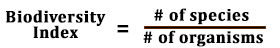 Biodiversity is a measure of the variety of life that occurs within an ecosystem. The number of different species that live in an ecosystem determine the biodiversity. The biodiversity index can be calculated by dividing the # of species by the # of organisms. The closer to 1 the biodiversity index is, the more diverse the community is.
