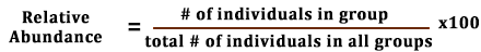 Abundance is the number of individuals present in each group relative to the total number of individuals. Abundance is calculated by dividing the number of individuals by the total number for all groups.