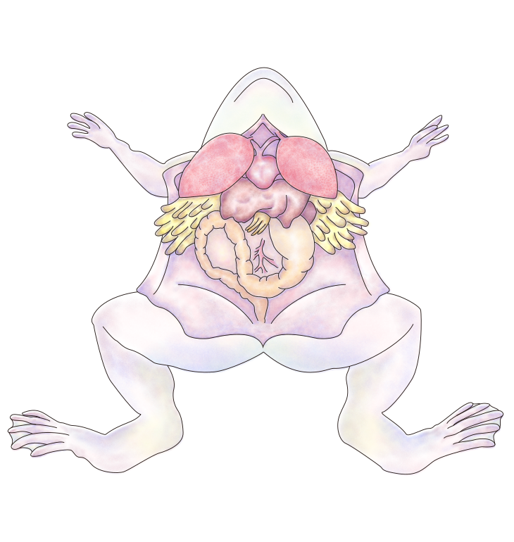 Close the mouth of the frog and pin both jaws down. Life the ventral trunk skin with forceps or needle, and with scissors make a longitudinal slit through the skin along the midline. Extend this slit forward into the lower jaw and backward to the end of the trunk. Make lateral cuts to each side, one set in front of the forelegs and another near the base of the hind legs, and pin the resulting flaps to the side. Note the ventral body-wall muscles, and along the mid ventral line, the ventral abdominal vein.