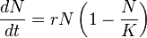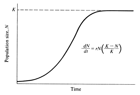 Where (dN/dt) is the rate of increase of the population and N is the population size, r is the intrinsic rate of increase. K is the carrying capacity of its local environmental setting. Thus, the equation relates the rate of change of the population N to the current population size and is the theoretical maximum rate of increase of a population per individual.