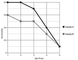 3. In Africa, AIDS takes its toll on the population, but deaths occur most frequently in the 20-40 age group. Show a survivorship curve that would illustrate this pattern.