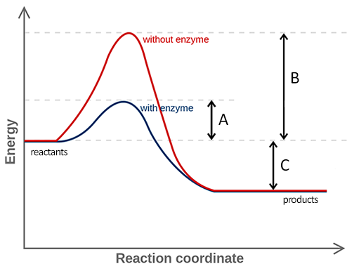 2. Enzymes speed up the reaction by lowering the activation energy needed for the reaction to start. Compare the activation energy with and without the enzyme.