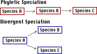 The fossil record cannot accurately determine when one species becomes another species. However, two hypotheses regarding speciation also exist. Phyletic speciation suggests that abrupt mutations in a few regulatory genes occur after a species has existed for a long period of time. This mutation results in the entire species shifting to a new species. Phyletic speciation would also relate to the