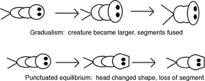 There are two major hypotheses on how evolution takes place: gradualism and punctuated equlibrium. Gradualism suggest that organisms evolve through a process of slow and constant change. For instance, an organism that shows a fossil record of gradually increased size in small steps, or an organism that shows a gradual loss of a structure. Punctuated equilibrium suggests that species evolve very rapidly and then stay the same for a large period of time. This rapid change is attributed to a mutation in a few essential genes. The sudden appearance of new structures could be explained by punctuated equilibrium.