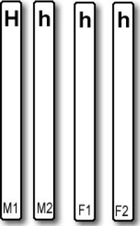 2. Obtain four popsicle sticks that will represent the chromosomes of your parents. Arrange them so that the male’s set (Hh) is on one side and the female’s set (hh) is on the other side.