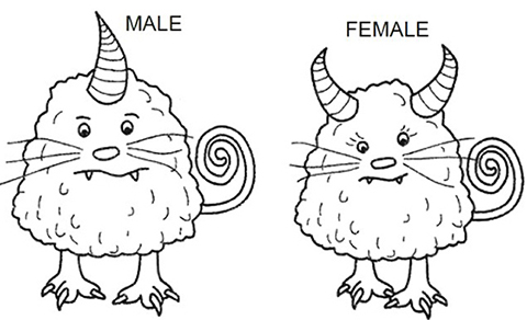 1. The image shows a male and female hornmonster, each with different genetic traits. The allele for one horns is dominant over the allele for two horns.