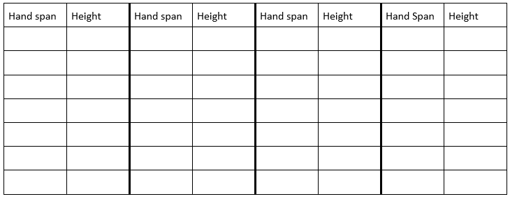 Use a ruler to measure your handspan, the class will compile the data from each person and organize on the chart below. Then create a bar chart that compares the numbers of students. Create two bars for each value, blue for males and red for females.