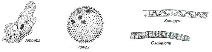 - Euglena: Unicellular organisms with a flagellum for movement and chloroplasts for photosynthesis.