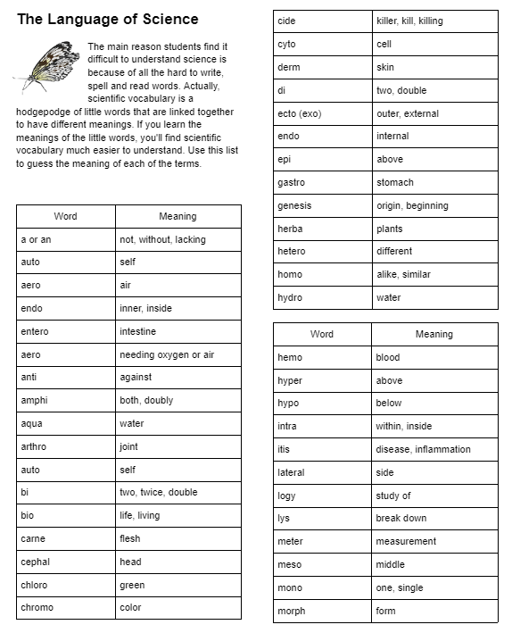 The main reason students find it difficult to understand science is because of all the hard to write, spell and read words. Actually, scientific vocabulary is a hodge podge of little words that are linked together to have different meanings. If you learn the meanings of the little words, you'll find scientific vocabulary much easier to understand. Use this list to guess the meaning of each of the terms.