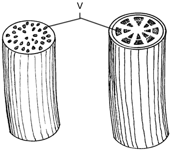 Monocot and dicots also differ in the way their vascular systems are arranged. In monocots, the vascular bundles are scattered throughout the stem. In dicots, the vascular bundles are arranged in a ring. Color the vascular bundles in both types of plants purple (V), color the stems blue.