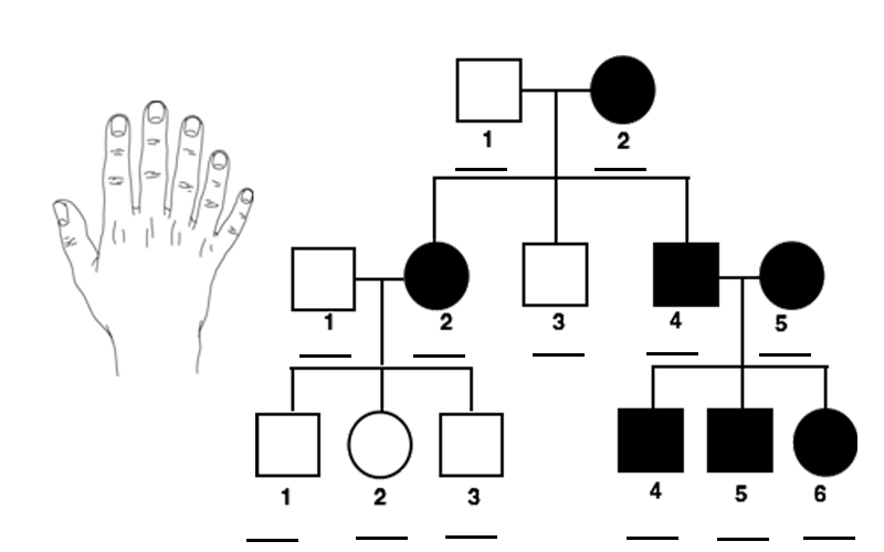 1. In humans, polydactyly is a condition where a person has extra fingers or toes. The allele that causes this trait is dominant. A person with Dd or DD will have extra digits. Fill out the pedigree of this family where polydactyly has been observed.