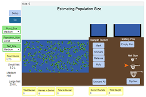 The simulator shows tadpoles in a pond with controls that allow you to change the pond size, population size, and the size of the net used to capture the tadpoles.
