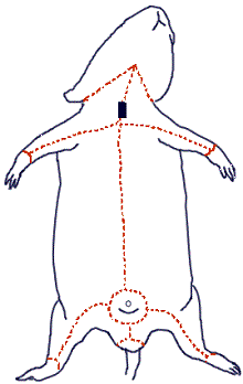 You will carefully remove the skin of the rat to expose the muscles below. This task is best accomplished with scissors and forceps where the skin is gently lifted and snipped away from the muscles. You can start at the incision point where the latex was injected and continue toward the tail. Use the lines on the diagram to cut a similar pattern, avoiding the genital area. Gently peel the skin from the muscles, using scissors and a probe to tease away muscles that stick to the skin.