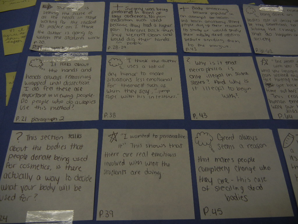 As you read the chapters in Stiff, attach a post-it note to pages where you highlight something interesting. You should have 4-10 Post-It's per chapter, use the following symbol guide to create your notes. Stiff has 12 chapters, you are only required to map (Post-It) 8 of those chapters. You are welcome to read them all, of course, but you can also choose to focus on chapters that interest you the most or skip those you do not find interesting. You may wish to skim the chapters or browse the table of contents.