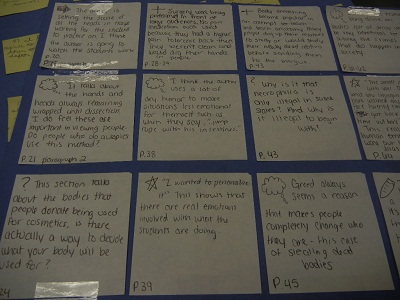 When you are finished, remove all of your post-it notes from the book (check to be sure you have page numbers listed). You will then place these post its on notebook or plain white paper. No more than 6 post-its per page and you will need to reinforce them with tape or glue so that none of them get lost.